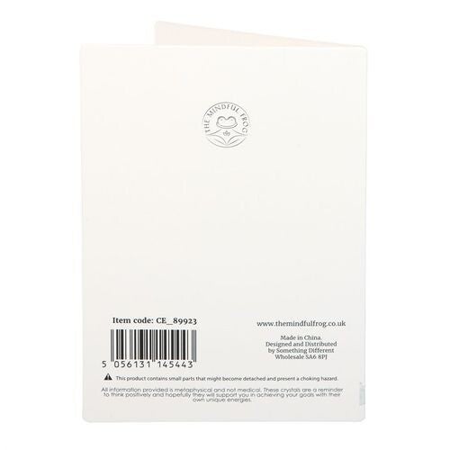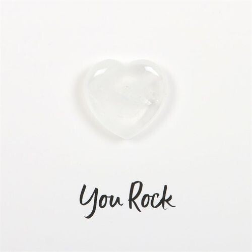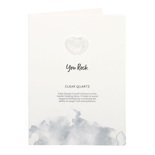 Give the gift of positivity with this meaningful crystal greeting card. Includes a small clear quartz crystal heart attached to a greeting card with ‘You Rock’ text. Clear quartz is known as the master healing stone and helps one avoid negative feelings by promoting positivity and patience. Card left blank inside. Envelope included.